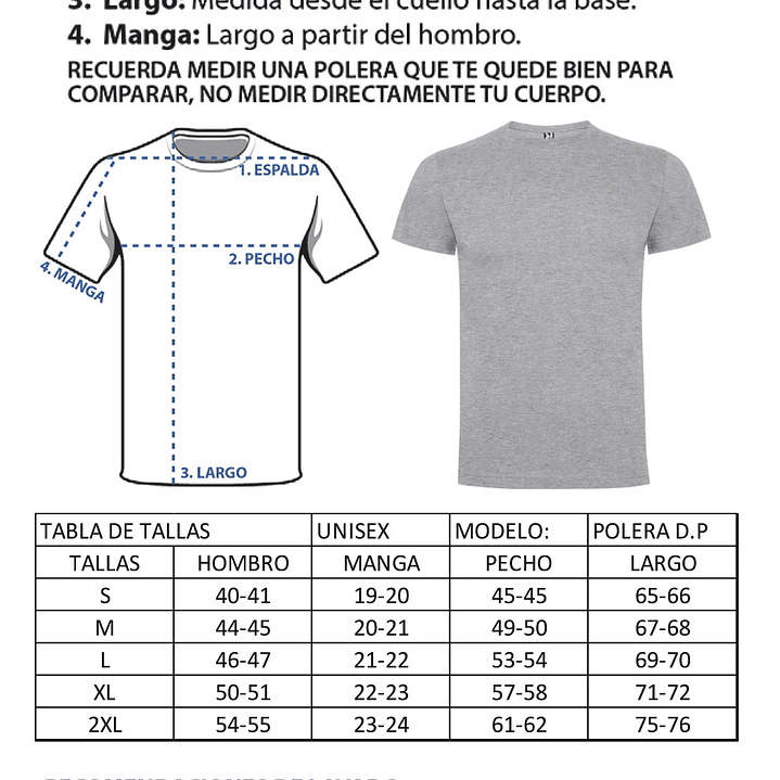 2. El corte de la polera es UNISEX por favor realizar la respectiva medida sobre una prenda que tenga, como indica la tabla de tallas.